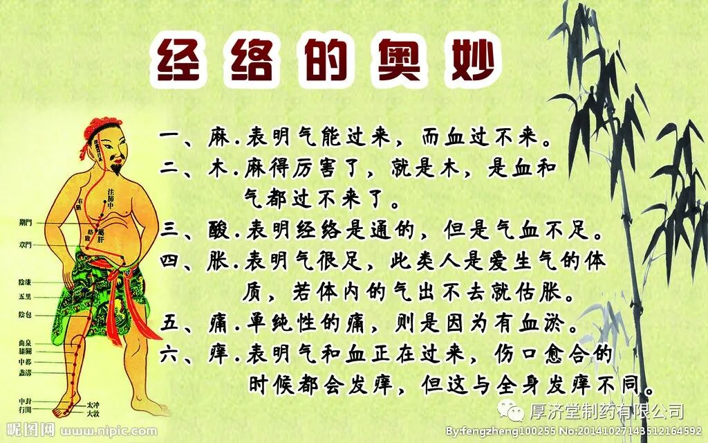 经络不通进一步的发展就是麻或木。比如我们坐得太久,下肢气血不通,就会疼痛;接着,经络被堵死,气血彻底不通,双腿就会麻木,只有改变坐姿,气血通畅才能恢复知觉。